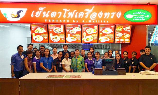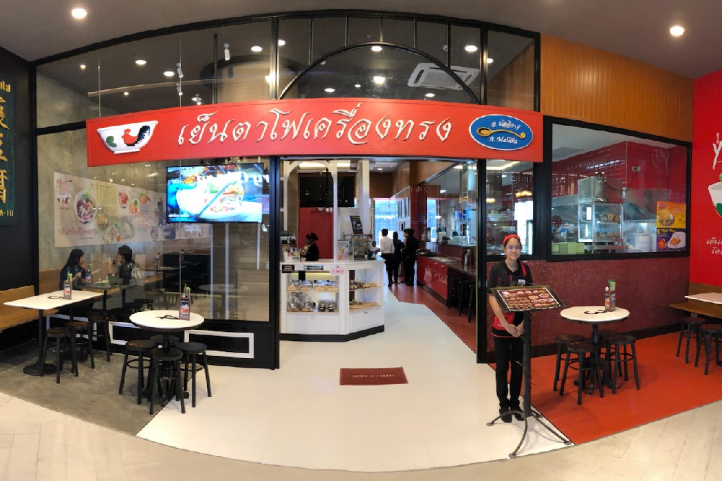 อ.มัลลิการ์ เล่าถึงที่มาของเย็นตาโฟเครื่องทรงว่า สมัยที่ทำร้าน อ.มัลลิการ์ สาขาแจ้งวัฒนะนั้นมีลูกน้องทำงาน ที่ร้านขอให้อาจารย์ช่วยลงทุนเปิดร้าน เย็นตาโฟให้ โดยให้เหตุผลว่า ตนเองทำอร่อย ซึ่งอาจารย์ก็ลองให้ทำมาให้ทุกคนในร้านชิม ซึ่งรสชาติใช้ได้แต่ไม่ถึงกับอร่อย จนทำให้ลูกค้าต้องกลับมากิน ประกอบกับอาจารย์เอง เป็นคนที่ชอบทานก๋วยเตี๋ยวรสจัด อาจารย์จึงแนะนำรสชาติของเย็นตาโฟที่ อาจารย์อยากได้ไป จากนั้นก็ได้ ปรับปรุงสูตร จนได้สูตรที่เป็นเอกลักษณ์ของ อาจารย์มัลลิการ์ เย็นตาโฟเครื่องทรง ร้านแรกที่อาจารย์ลองเปิดขาย คือ ซอยรัชดานิเวศน์ แยกเหม่งจ๋าย โดยเปิดเมื่อต้นปี 2542 ซึ่งก็ได้รับความนิยมจากลูกค้ามาก จึงขยายไปเปิดที่นำโชค พลาซ่า ริมถนนแจ้งวัฒนะ และอีกสาขาคือที่ อ.มัลลิการ์ สาขาหน้า รร.มารวย ม.เกษตรศาสตร์ ที่ปิดไป เปิดเป็นร้านเย็นตาโฟแทน ซึ่งปรากฏกิจการ ร้านสาขา นำโชคไปได้ดีลูกค้าจอดรถเข้าออก ได้สะดวกต่างจากสาขาเหม่งจ๋ายและเกษตร ที่ทำเลร้านยังไม่อำนวยความสะดวก แก่ลูกค้าเช่นเคย อาจารย์จึงย้ายจากสาขาเกษตร ไปเปิดที่บริเวณศูนย์การค้าเมโทร ประตูน้ำ ซึ่งที่สาขานี้ก็ประสบปัญหาที่จอดรถ รวมถึงการเก็บค่าที่จอดรถ จึงเป็นเหตุให้ต้องปิด กิจการลงแต่ถึงกระนั้น อ.มัลลิการ์ ก็ยังไม่ละความพยายามที่จะเปิดร้าน เย็นตาโฟ อีกครั้งอาจารย์พยายามคิดรูปแบบของร้าน ให้โดดเด่น กว่าร้านก๋วยเตี๋ยวที่ขายอยู่ ทั้งนี้เพื่อให้เป็นที่พอใจของลูกค้ามากที่สุด และนั่น จึงเป็นที่มาของร้านเย็นตาโฟเครื่องทรง ที่มีเอกลักษณ์คือชามตราไก่ ขายเฉพาะเส้นใหญ่ และ ร้านที่เป็นสีแดงในปัจจุบัน